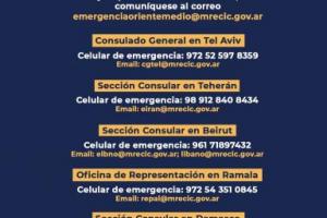 8) Contemplar que, en caso de conflicto generalizado, los sistemas de comunicaciones e informáticos pueden dejar de funcionar. Tener presente que la Sección Consular de la Embajada Argentina permanece abierta para consultas de connacionales ante situaciones de urgencia a través de las siguientes vías de comunicación: